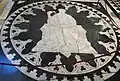 Unbekannt | ca. 1374 | nach 1865 | Die Darstellung ist dekorativer und stellt ein Rad, bzw. eine große Domrosette aus kleinen Säulen und Spitzbögen dar. Im Zentrum steht der Doppeladler, Wahrzeichen des Heiligen Römischen Reiches, der an die ghibellinische Loyalität der Stadt, die Kontinuität Sienas zur römischen Welt und die Bedeutung der höchsten Bürgermacht des Mittelalters erinnert. Obwohl diese Fläche im 19. Jahrhundert vollständig renoviert wurde, ist sie stilistisch gesehen auf eine Zeit unmittelbar nach der Wölfin zu datieren. | |