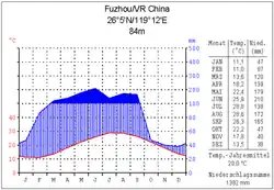 Die Provinz Fujian ist von warmfeuchtem und subtropischem Monsunklima geprägt. Die durchschnittliche Jahrestemperatur liegt zwischen 17 und 21 °C. Die Julitemperatur liegt an der Küste im Schnitt bei 30 °C, die Januartemperatur bei 10 °C; im Bergland sind diese Werte geringer. Die durchschnittliche Regenmenge liegt zwischen 1.100 und 2.000 mm (1.670 mm im Provinzdurchschnitt[5]), wobei der Hauptanteil (80–85 %) des Regens zwischen Mai und September fällt. Das westliche Bergland bekommt mehr Regenfälle als die Küstenregionen[5], insgesamt gehört Fujian zu den Regionen mit den meisten Niederschlägen Festlandchinas. Von Taifunen treten jährlich im Sommer und Herbst auf[1] und bedingen ausgedehnte Evakuierungen, wie im September 2005, als 760.000 Menschen vor dem Taifun Talim in Sicherheit gebracht werden mussten.