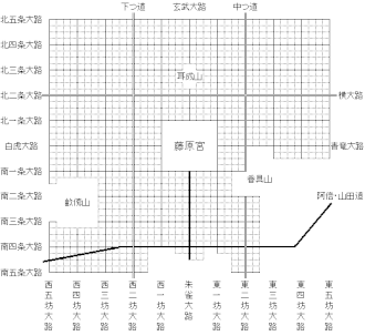 Nördlich des Zentrums der Stadtanlage befand sich der Palast Fujiwara (藤原宮 Fujiwara no Miya), von dessen Suzakumon (朱雀門, dt. „Tor des Roten Vogels“) aus in südlicher Richtung die größte Hauptstraße, genannt Suzaku-ōji (朱雀大路, dt. „Hauptstraße des Roten Vogels“) verlief. Diese war mit 20 m Breite relativ schmal, verglichen mit jenen von Heijō-kyō und Heian-kyō. Diese Straße teilte die Stadtanlage in einen östlichen, linken Bezirk (左京 Sakyō) und einen westlichen, rechten Bezirk (右京 Ukyō). Jeder dieser beiden Stadtteile war wiederum von Süd nach Nord in Jō (条) und von Ost nach West in Bō (坊) unterteilt, ein System der Stadtviertelung, welches als Jōbō-System (条坊制 Jōbō-sei) bezeichnet wird. Bezüglich deren Anzahl werden entweder 12 Jō und 8 Bō (4 Bō pro Bezirk) bzw. 10 Jō und Bō (5 Bō pro Bezirk) angenommen.[1] Jeweils vier Bō unterstanden einem von insgesamt zwölf Verwaltern, die Bō-rei (坊令) genannt wurden.