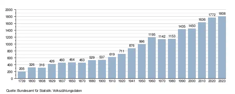 - ↑ Daten der Eidgenössischen Volkszählungen ab 1850 nach Gemeinden. (XLSX; 10 MB) Bundesamt für Statistik, Neuchâtel, 12. Juli 2024, abgerufen am 31. Juli 2025 (Öffnung in Excel nur über "Anhang/Excel-Datensatz" möglich).