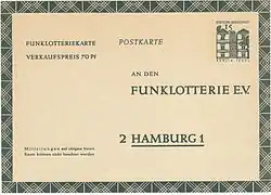 Die Lotterie wurde von der Deutschen Hilfsgemeinschaft über den Norddeutschen Rundfunk veranstaltet, und diese Postkarten dienten zur Teilnahme an der Lotterie der Ratesendung Funklotterie. Für die ersten Sendungen ab 15. August 1948 gab es noch weder spezielle Postkarten noch sonstige Formulare hierfür, als Bezahlung legten die Teilnehmer daher einen 50-Pfennig-Geldschein im Brief bei.[1] Die ersten Exemplare der Postkarten erscheinen am 10. Mai 1949 mit Wertstempeleindruck von zunächst 10 Pfennigen. Der Verkaufspreis betrug anfangs 70 Pfennige und wurde aber am 27. Juli 1951 auf 65 Pfennige gesenkt. Der Gewinn wurde für wohltätige Zwecke verwendet. Zwischenzeitlich lief die Sendung ab November 1961 mit Ausgaben im Fernsehen, sie wechselte dann aber nach zwölf Folgen wieder zurück auf das Radioformat.[2] Die Funklotterie wurde im April 1969 eingestellt. Moderatoren der Sendung waren Just Scheu, Carl Voscherau und Annette von Aretin.[3]