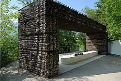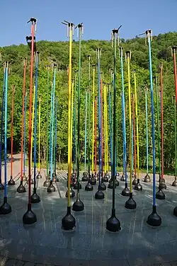 - Eine begehbare rostige Stahlkuppel, an der Plexiglasplättchen in den Farben des Herbstes schimmern, erinnert an einen Laubhaufen.