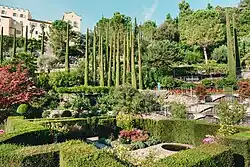 Die Wasser- und Terrassengärten präsentieren Beispiele europäischer Gartenarchitektur. Streng geometrisch angeordnete Beete, kugelförmig oder rechteckig geschnittene Buchsbäume und ein Irrgarten sind Merkmale eines Italienischen Gartens der Renaissance. Der Englische Staudengarten orientiert sich ebenfalls an geometrischen Formen. Blühende Sträucher und Stauden im Wandel der Jahreszeiten lockern im Cottage-Garten die starren Formen jedoch auf. Im „Sinnesgarten“ gedeihen aromatische Zwergsträucher in Hochbeeten, die den Besuchern ermöglichen, die Pflanzen zu ertasten und an ihnen zu riechen. Am Fuß der geometrischen Gärten liegt ein Teich mit Seerosen und Lotosblumen, den am gegenüberliegenden Ufer ein Palmenwald säumt. In Themengärten zusammengefasst finden sich Duftrosen, Passionsblumen, Clematis und Staudenpfingstrosen.