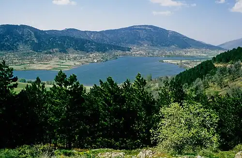 Blick von Südosten auf den Gölcük Gölü (Gölcük-See), das Herz der Gölcük Yaylası in den Bozdağlar (Ägäis-Region)