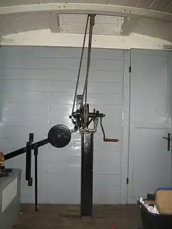 - ↑ In der Mitte dieser Zeichnung der ebenfalls mit einem Seil bedienten Heberleinbremse ist eine solche Umlenkrolle q über der Seilwinde zu sehen.