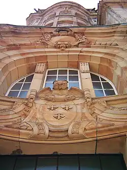 Gestaltungselemente über dem Westeingang des Görres-Gymnasiums an der Bastionstraße. Das Symbol der Weisheit (die Eule) wacht über dem Wappen des Symbols des Fleißes (den Bienen).