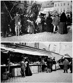 In der Göttinger Zeitung taucht der Christmarkt ab dem 20. Dezember 1864 auf, meist mit Anzeigen zum Verkauf von Süß- und Backwaren zum Behängen der Christbäume.[2] Der Christmarkt 1901 fand um den neuen Gänseliesel-Brunnen statt, welcher großzügig freigehalten wird, so dass die Tannenbaumverkäufer auf den Johanniskirchhof ausweichen müssen. In dieser Zeit findet der Markt vom 16. bis 24. Dezember statt; dies variierte aber in den folgenden Jahren. 1902 wird der Markt immer öfter Weihnachtsmarkt genannt, und es wird vom Verkauf von Weihnachtsbäumen gesprochen. Diese sind wie der Baumschmuck und Spielzeug immer noch die marktspeziellen Waren.[3]