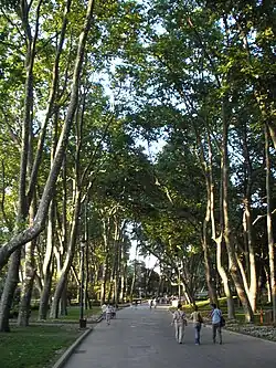 Der Gülhane-Park war einst Teil des äußeren Gartens des Topkapı-Palasts. Ein Teil des Gartens wurde im Jahre 1912 von der Stadtverwaltung der Öffentlichkeit zugänglich gemacht. War er früher ein Ort für ritterliche Spiele und Bogenschießwettbewerbe, so ist er heute ein bewaldeter Volkspark mit Livekonzertangeboten, Teegärten und weiteren typischen Angeboten. Die äußeren Mauern markieren in etwa die Begrenzungen des alten Byzantion. Neben dem Haupteingang, dem „Tor des kalten Brunnens“ (Soğuk Çeşme Kapısı), befindet sich auf einem Mauerturm der polygonale „Pavillon der Festaufzüge“ (Alay Köşkü), durch dessen Fenster der Sultan die Bewegungen vor der gegenüber liegenden Hohen Pforte, dem Amtssitz seines Großwesires, überwachen konnte. Den Pavillon in seiner heutigen Gestalt mit seinem Schweifdach ließ Sultan Mahmud II. 1819 restaurieren und gestalten. Der Alay Köşkü ersetzte einen Vorgängerbau des Sultans Murad III. Unter anderem von hier beobachteten die Sultane die prachtvollen Festumzüge und Paraden. Am berühmtesten waren die tage- oder wochenlangen Aufzüge der Kaufmannsvereinigungen und Handwerkerzünfte, die in jedem Jahrhundert nur ein- oder zweimal abgehalten wurden. So nahmen zum Beispiel 1637 an einem Umzug 1109 Zünfte teil,[1] die auf Wagen farbenfrohe Darbietungen ihrer Künste boten und zuweilen karnevalesk ausfielen. Zuletzt fand eine solche Gesamtschau des Wirtschaftslebens unter Mustafa II. 1769 statt. Am 8. August 1928 verkündete Mustafa Kemal Atatürk auf diesem Platz die Einführung des türkischen Alphabets mit lateinischen Schriftzeichen.[2] Seit 1970 beherbergte dieser Kiosk die Kunstwerke der zum Topkapı Müzesi gehörigen Sammlung Kenen Ozbel. Seit 2011 befindet sich dort die Ahmet Hamdi Tanpınar Edebiyat Müze Kütüphanesi.