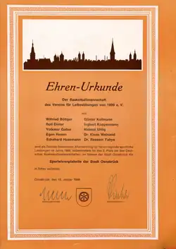 - ↑ Das Basketballspiel in Osnabrück. Darstellung der Entwicklung eines Sportspiels in einer Großstadt. Bodo Bernhardt, Semesterarbeit Sport. Sommersemester 1968, bei Hermann Westerhaus.