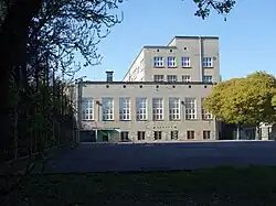 In der Nähe der Schule, etwa 300 Meter östlich auf der gegenüberliegenden Straßenseite, lag ein Sportplatz, was offenbar gerade unter der NS-Herrschaft ein wichtiges Kriterium für einen Schulstandort bildete. Dieser Sportplatz ist auf einem Luftbild von 1942[12] zu erkennen, auf dem polnischen Stadtplan 1939 schemenhaft eingezeichnet und auf dem von 1948 sehr deutlich.[13]