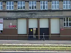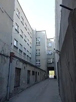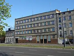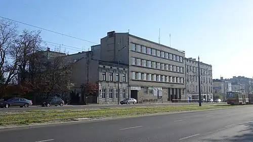 In der Mitte das Gebäude der Grundschule Nr. 4 von Łódź (2016), das von 1941 bis 1944 der Prienschule diente und sich auf einem schmalen länglichen Grundstück senkrecht zur Straße erstreckt