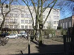 Ansicht von Westen: rechts die Turnhalle, hinter der einstöckigen Holzhäusern-Reihe erstreckt sich der Schulhof (2016)