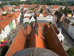 Auf dem zentralen Platz stand im Mittelalter im 13. Jahrhundert mittig das erste gotische Rathaus, ersetzt durch einen Neubau von um 1800, und die 1308 ersterwähnte Pfarrkirche, die 1503 abbrannte und 1508 durch einen Neubau ersetzt wurde.
