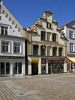 - Nr. 23: 3-gesch. neoklassizistisches giebelständiges Wohn- und Geschäftshaus mit Hintergebäude (D), Schaufassade mit Stufengiebel und halbrundem markanten Schmuckelement, saniert Ende der 1990er Jahre