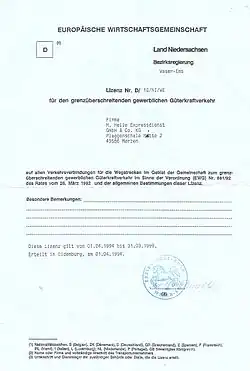 Die EU-Gemeinschaftslizenz (Genehmigung)[3] wird für die Beförderung innerhalb der EU beziehungsweise durch fremde Gebiete wie die EWR-Staaten benötigt und berechtigt ebenfalls unter bestimmten Bedingungen zum Kabotageverkehr. Transportbetriebe dürfen keine Briefkastenfirmen unterhalten, sondern sind verpflichtet, im EU-Niederlassungsland einen Firmensitz mit Verwaltungsbüro und ein Transportzentrum zu unterhalten. Ein Elektronikregister wird die Rechtsverstöße und Strafen der Transportunternehmen festhalten und die Unionsländer werden die Daten im Bedarfsfall untereinander austauschen.[4] Ein Kabotageverkehr von Transportunternehmen aus den Drittstaaten ist nicht erlaubt.