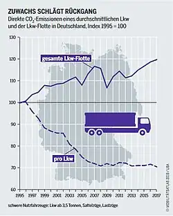 In Deutschland verursacht der Güterverkehr auf der Straße über ein Drittel aller verkehrsbedingten CO2-Emissionen (über 40 Millionen Tonnen). Zwar sind seit Mitte der 1990er Jahre die CO2-Emissionen per LKW deutlich gefallen, doch wurden gleichzeitig immer mehr Güter per LKW befördert. Seit 1970 hat sich in Deutschland die LKW-Transportleistung mehr als verzehnfacht – von zirka 42 Milliarden Tonnenkilometer (1970) auf 491 Milliarden Tonnenkilometer (2017), während beispielsweise der Transport per Schiene ständig zurückging.[5]