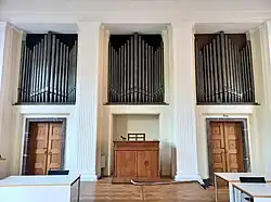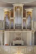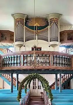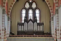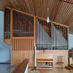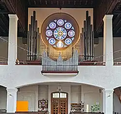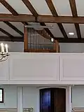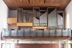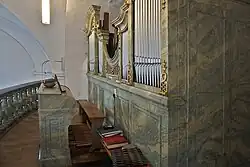 I/P | 5 | Der Prospekt an der Brüstung besteht aus Blindpfeifen. Das Werk befindet sich in einem eigenen Gehäuse hinter dem Spieltisch. → Orgel | ||||||||