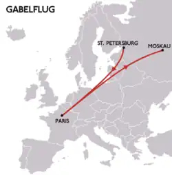 Ein Gabelflug ist auch gegeben, wenn der Ausgangspunkt der Reise nicht mit dem Endpunkt identisch ist, also zum Beispiel ein Hinflug von Paris nach Moskau, und Rückflug von Moskau nach Lyon. Eine Bedingung für einen Gabelflug ist aber, dass die beiden unterschiedlichen Zielpunkte – beispielsweise also St. Petersburg und Moskau bzw. Paris und Lyon – in ein und demselben Zielgebiet liegen.