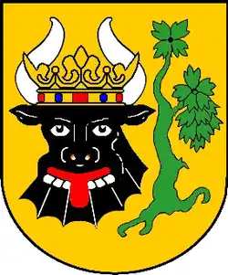 Blasonierung: „In Gold rechts ein hersehender, golden gekrönter schwarzer Stierkopf mit aufgerissenem roten Maul, silbernen Zähnen, ausgeschlagener roter Zunge, in sieben Spitzen abgerissenem Halsfell und silbernen Hörnern, links ein ausgerissener grüner Busch mit dreizackigen Blättern.“[19]