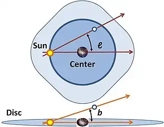 Das galaktische Koordinatensystem nutzt die Sonne als Ursprung. Die galaktische Breite ist der Winkel zwischen der galaktischen Ebene und dem Objekt. Die galaktische Länge wird in der galaktischen Ebene in Bezug zur Richtung Sonne – Galaktisches Zentrum gemessen.