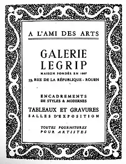 Die Galerie Legrip, auch bekannt als „A l'Ami des Arts“, kann zwar nicht direkt mit den Pariser Galerien des späten 19. und frühen 20. Jahrhunderts verglichen werden, war aber dennoch eine angesehene Adresse in Rouen. Gegründet wurde die Galerie 1807 von Claude Démétrius Legrip (1776–1848), dessen Familie einer langen Tradition von Faïenciers entstammte. Vier Generationen führten die Galerie, die Kunsthandel, Künstlerbedarf und Einrahmungen anbot.[1]