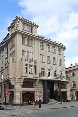 Sein Haupteingang erhielt, ebenso wie das Foyer, eine repräsentative Ausstattung. Dazu gehören zwei Bronzeplastiken von Ladislav Šaloun im Außenbereich des Haupteingangs. Die linke Plastik (Obchod / Gewerbe) zeigt einen Mann in lesender Haltung mit einem großen Buch in der linken Hand. Auf der rechten Seite steht eine Frauenfigur (Úroda / Ernte), die in ihren beiden Händen eine Fülle von Gartenfrüchten hält. Die zweiflügelige Eingangstür ist ein Bronzearbeit mit verschiedenen rahmenartigen Verzierungen in Form von Treibearbeiten und jeweils einer senkrecht angeordneten Reihe kleiner quadratischer Fenster. Über ihr ist ein Oberlichtfenster mit facettierten Glasscheiben und ornamentaler Gestaltung eingesetzt.