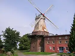 Die Galerieholländer-Windmühle auf einem dreigeschossigen, polygonalen, teils stark geschädigten Backsteinunterbau mit rundbogigen Öffnungen wurde von 1845 bis 1848 an der Stelle der Bockwindmühle gebaut. Sie beherrscht das Landschaftsbild an der Oste.