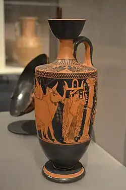 - Lekythos, Boston, Museum of Fine Arts Inventarnummer 13.195, gefunden in Gela, Motiv: Kühe werden in einer Prozession zum Opferaltar gebracht[1]