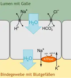 Die von der Leber produzierte Galle dient der Verdauung von Fetten im Darm. Über den Ductus choledochus wird die Galle über die Papilla duodeni major in den Zwölffingerdarm abgegeben. Die Schließmuskeln (M. sphincter ampullae und M. sphincter ductus choledochi) im Bereich dieser Mündung können durch ihre Kontraktion das Abfließen der Galle verhindern, so dass diese sich in die über den Ductus cysticus zwischengeschaltete Gallenblase zurückstaut. Diese Speicherung erfolgt vor allem zwischen den Mahlzeiten (interdigestiv) und betrifft ungefähr die Hälfte der von der Leber sezernierten Galle. Das Organ fasst etwa 50 ml Gallenflüssigkeit, deren Konzentration aber durch den aktiven Entzug von Wasser stark erhöht werden kann. Die Galle kann so auf bis zu zehn Prozent des ursprünglichen Volumens angereichert („eingedickt“) werden. Teilweise wird in diesem Zusammenhang die ursprüngliche „Lebergalle“ von der modifizierten „Blasengalle“ unterschieden. Letztere zeichnet sich vor allem durch eine erhöhte Konzentration von Gallensäuren, Lecithin, Gallenfarbstoffen und Cholesterol aus. Die Eindickung erfolgt durch die Verschiebung von Natrium- und Chlorid-Ionen unter Verwendung eines Na+/H+- sowie eines Cl−/HCO3−-Antiport-Transportsystems in der apikalen (luminalen) Membran der Hauptzelle. Diese Verschiebung ist elektroneutral, das heißt, es werden dabei netto keine Ladungen verschoben. Das in der Galle enthaltene Wasser folgt diesen resorbierten Ionen aufgrund deren osmotischer Wirksamkeit. In der basolateralen Membran der Zelle befindet sich eine Na+/K+-ATPase, welche die intrazelluläre Natrium-Konzentration konstant hält. Das resorbierte Wasser wird in den Blutgefäßen der Lamina propria abtransportiert.[7]