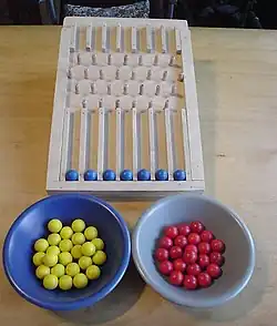 Das Spielbrett ist ein schräg gestelltes Holzbrett, in dem oben eingeworfene Murmeln durch ein Labyrinth klackern und unten in Fächer fallen. Es gibt oben sieben mögliche Einwurfstellen und unten sieben nebeneinander angeordnete Fächer. In jedes Fach passen sechs Murmeln übereinander.[1]