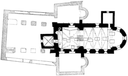 Plan der Kirche von Alt-Uppsala. Die schwarzen Mauern stellen den heutigen Zustand dar und die grauen Mauern sind solche, die bei Ausgrabungen gefunden wurden.
