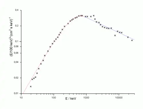 - ↑ Die Auswertung der BATSE-Messungen ergaben Werte für hauptsächlich zwischen −1,25 und −0,25 und für 2,12 ± 0,3