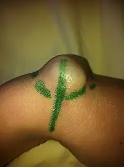 Ein Ganglion (griechisch γάγγλιον „Geschwulst“, „knotenartig“, umgangssprachlich wie andere ähnlich aussehende Phänomene ungenau auch „Überbein“) ist eine einzeln oder mehrfach auftretende, gutartige Geschwulstbildung im Bereich einer Gelenkkapsel oder oberflächlichen Sehnenscheide (Sehnenscheidenhygrom).[1] Die Bezeichnung „Überbein“ ist insofern irreführend, als die Verwendung des Begriffs „Bein“ die Betroffenheit eines Knochens suggeriert (vgl. Nasenbein, Fersenbein, Schienbein). Ein wirkliches Überbein wird Exostose genannt.
