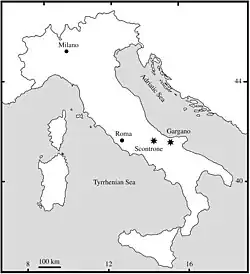 Erstmals wurden bei Apricena in Gargano Überreste von Garganornis ballmanni gefunden. Eine Altersbestimmung ergab, dass das Tier im Miozän vor knapp 6 bis 5,5 Mio. Jahren gelebt hatte. Der Holotypus wurde 2014 von Meijer anhand eines linken Tibiotarsus (RGM 443307) erstbeschrieben.[1] 2016 wurden bei Gargano mehrere Carpometacarpi (DSTF-GA 49, NMA 504/1801), Tarsometatarsi (RGM 425554, RGM 425943), ein Tibiotarsus (DSTF-GA 77) und mehrere Fingerknochen des Fußes (MGPT-PU 135356, RGM 261535, RGM 261945) durch Pavia et al. beschrieben. Parallel dazu wurden in Scontrone andere, geologisch zwar ältere, aber morphologisch vergleichbare Funde von etwa 9 Mio. Jahren Alter entdeckt. Diese umfassen einen fast kompletten Tarsometatarsus (SCT 23).