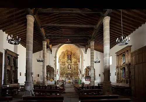 - Die Iglesia de San Lorenzo ist ein eher schlichter Bau aus dem 16. Jahrhundert. Das durch Säulen in drei Schiffe unterteilte Innere der Kirche ist von einem offenen hölzernen Dachstuhl bedeckt; die von einer Kuppel aus Ziegelsteinen bedeckte Apsis bewahrt ein mächtiges spätbarockes Altarretabel mit sogenannten Salomonischen Säulen im Stil des Churriguerismus.[8]