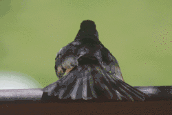 Jungvögel sind auf der Oberseite nicht tiefschwarz, sondern eher dunkelgrau, ihre Flügelenden sind bräunlich. Seinen teilweise melodisch zwitschernden, jedoch von rhythmisch-mechanisch klingenden Elementen durchsetzten Gesang trägt er vor allem nachts vor.