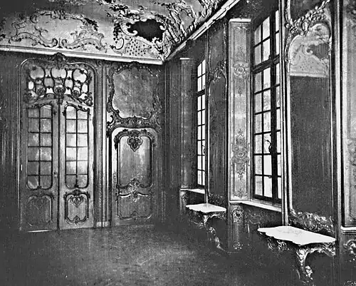 Der ehemals eichenholzvertäfelte Gartensaal ist heute vor Ort nicht mehr erhalten. Zwischen den Fenstern wurden ursprünglich über den kleinen Konsolentischen mit Marmorplatten hohe Spiegel angebracht, um die Lichtverhältnisse im Raum zu verbessern. Eine Kamineinfassung aus Marmor befindet sich heute im Grünen Salon des Couven-Museum am Hühnermarkt. Eine allegorische Darstellung des Zeus in einem geschnitzten Holzrahmen, der ursprünglich über dem Kamin hing, wurde ebenfalls in den Grünen Salon des Couven-Museums transloziert. Oberhalb der Spiegelrahmen verzierten ehemals kleine Gemälde den Innenraum. Während die beiden, ehemals nach außen führenden, zweiflügeligen Außentüren mit den geschnitzten, durchbrochenen Oberlichtern heute in den Festsaal des Couven-Museums integriert wurden, sind die einflügeligen Türen mit den allegorische Darstellungen in den Supraporten nicht mehr erhalten.