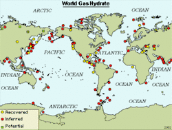 Seismische Untersuchungen in neuerer Zeit lassen vermuten, dass die Menge der Methanhydrat-Lagerstätten auf dem Meeresgrund sehr bedeutsam ist. Sie könnten daher eine mögliche wichtige Energiequelle sein, auch wenn der verlustfreie Abbau sich als recht schwierig erweisen könnte, da Methan als Treibhausgas nicht in größeren Mengen in die Atmosphäre gelangen darf. Die gesamte Menge der Treibhausgase aus fossilen Brennstoffen soll geringer sein als die Menge der Treibhausgase, die aus den Gashydratvorkommen freiwerden könnte. Sowohl Kohlenstoffdioxid als auch Methan sind Treibhausgase. Schätzungen gehen von einer Gesamtmenge von mehr als 1.000 Gigatonnen Kohlenstoff aus, der in den verschiedenen Arten von Gashydraten gespeichert ist.[3]