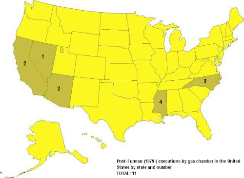 Nach der Wiederaufnahme der Hinrichtungen seit 1977 sind insgesamt elf Personen in fünf Bundesstaaten (siehe Karte) durch Gas exekutiert worden. Der erste nach Wiederaufnahme der Todesstrafe Hingerichtete und bisher einzige im US-Bundesstaat Nevada, der in einer Gaskammer starb, war der 66-jährige Jesse Bishop. Der bisher letzte Mensch, der in den USA in einer Gaskammer hingerichtet wurde, war am 3. März 1999 der wegen Mordes verurteilte Deutsche Walter LaGrand im Bundesstaat Arizona. Er konnte zwischen Giftspritze und Gas wählen und hatte sich für die Gaskammer entschieden.[4] Der Internationale Gerichtshof urteilte 2001, dass diese Hinrichtung, die trotz einer einstweiligen Anordnung seitens des IGH vollstreckt wurde, gegen das Völkerrecht verstieß.[5]