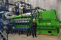 Bei den eingesetzten Maschinen handelt es sich meistens um Gasturbinen;[2] alternativ kommen je nach Einsatzart und Größe auch Gasmotoren (interne Verbrennung) oder Stirlingmotor (externe Verbrennung) in Frage. Während Motoren vor allem als kleinere (Not-)Stromaggregate oder als kompakte Blockheizkraftwerke für die dezentrale Strom- und Wärmeversorgung verbreitet sind,[9][10][11] finden größere Gasturbinenkraftwerke als Industriekraftwerke und in der öffentlichen Stromversorgung Verwendung (letzteres wegen der unten genannten Nachteile heute nur noch als Spitzenlastkraftwerk).