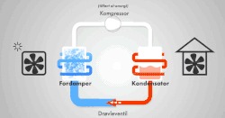 Ein Kältemittel, das in einem geschlossenen Kreislauf bewegt wird, erfährt nacheinander verschiedene Aggregatzustandsänderungen. Dabei wird ausgenutzt, dass sich die Kondensations- und die Siedetemperatur eines Gases (hier des Kältemittels) abhängig von seinem Druck verändert. Das gasförmige Kältemittel wird zunächst durch einen Kompressor komprimiert (verdichtet), wobei die Siedetemperatur steigt. Im folgenden Wärmeübertrager (Verflüssiger) kondensiert (verflüssigt) es unter Wärmeabgabe. Anschließend wird das flüssige Kältemittel aufgrund der Druckänderung über eine Drossel, zum Beispiel ein Expansionsventil oder ein Kapillarrohr, entspannt, wobei die Siedetemperatur sinkt. Im nachgeschalteten zweiten Wärmeübertrager (Verdampfer) verdampft das Kältemittel unter Wärmeaufnahme bei niedriger Temperatur (Siedekühlung). Der Kreislauf kann nun von vorne beginnen. Der Prozess muss von außen durch Zufuhr von mechanischer Arbeit (Antriebsleistung) über den Kompressor in Gang gehalten werden.