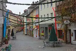 - Von-Römer-Straße, bis 1889 Judengasse:[7] Die dicht gereihte Häuserzeile im Westen der Straße steht mit den westlichen Außenwänden der Gebäude auf der Stadtmauer auf. Nahe ihrem nördlichen Ende befand sich mit dem Unteren Tor eines der beiden Stadttore. Hinter den Häusern Von-Römer-Straße 2 und 4 ist ein ehemaliger Wehrturm, der sogenannte Schwertlesturm, noch vorhanden. Um 1700 hatte der Stadtbrunnenmeister im Haus Von-Römer-Straße 9 seine Wohnung. Sie ist von einer überwiegend traufständigen Bebauung des 18. Jahrhunderts bestimmt, nachdem die Stadtmauer geschleift worden war und überbaut werden durfte. In das Haus Von-Römer-Straße 28 eingebaut ist der Rest eines spitzwinkeligen Ravelins aus der Mitte des 17. Jahrhunderts erhalten.[1]