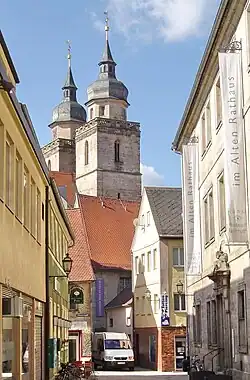 - Kirchplatz: Der Platz wird von der freistehenden Stadtpfarrkirche, einer dreischiffigen basilikalen Anlage mit Zweiturmfassade, dominiert. Er beherbergte einst einen Kirchhof, der allerdings nicht als regulärer Begräbnisplatz diente. Südlich der Kirche wurde um 1790 der Obeliskenbrunnen angelegt. Dort befand sich bis zu seinem Abbruch 1786 ein Beinhaus, das nach der Reformation als Almosenkasten genutzt wurde. Unmittelbar nördlich am Kirchhof und in funktionaler Abhängigkeit von der Stadtkirche steht die ehemalige Lateinschule (Kirchplatz 4, spätere Mädchenschule, im 20. Jahrhundert als Feuerwehrhaus („Central-Feuerhaus“) und heute als Historisches Museum genutzt). Der stattliche, breit gelagerte Sandsteinquaderbau wurde vermutlich über einem älteren Kern errichtet und im 18. Jahrhundert überformt. Ein danebenliegender Abschnitt des Platzes wurde umgewidmet und trägt seit 2013 den Namen Bernd-Mayer-Platz, in den 1990er Jahren wurde der ehemalige Siechen- oder Armenhausbrunnen von 1870 dorthin versetzt. Im Osten des Platzes steht das schmale „Schwindsuchtshäuschen“, ein Rückgebäude der Kämmereigasse 3; das Haus Kirchplatz 7 beherbergte die Stadtwaage.[1] Die Gebäude Kirchplatz 2 (Pfarrhaus) und 4 wurden in den 1970er Jahren und Kirchplatz 5 (heute Diakonisches Werk) bald darauf abgebrochen und durch Neubauten ersetzt.[10]