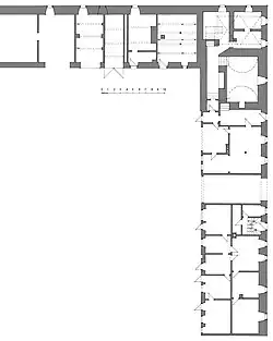 - ↑ Erdgeschoßgrundriss mit Vorburg 1677, ThStA Gotha (E XI, Nr. 37/38, Bl. 165/166) Gotha 1677, umgezeichnet durch Beatrice Waldheim