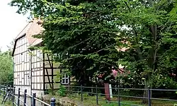 Das zweigeschossige Fachwerkhaus entstand nach einer Bauinschrift im Jahr 1699[1] und diente als Wassermühle. Dementsprechend verläuft unmittelbar an der westlichen Außenwand der Mühlgraben. Das obere Stockwerk des Hauses kragt auf der nördlichen Gebäudeseite über das Untergeschoss über. Die Fachwerkfassade ist mit Pyramidenbalkenköpfen verziert. Ein zweigeschossiger Seitenflügel wurde ebenfalls in Fachwerkbauweise errichtet und stammt aus dem Jahr 1844.