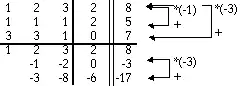 Zur zweiten Zeile wird also das -fache und zur dritten Zeile das -fache der ersten Zeile addiert. Damit null wird, wird im nächsten Schritt ein Vielfaches der neuen zweiten Zeile zur neuen dritten Zeile addiert, in diesem Fall das -fache: