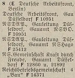 Nach Abtrennung der Kreisgebiete von Kleve, Geldern und Moers waren noch folgende Kreisleitungen der NSDAP dem Gau Düsseldorf unterstellt: