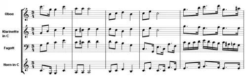 Die einprägsame Melodie beginnt mit zwei Quart-Intervallen, verwendet dann hauptsächlich Sekundschritte (26-mal) und einige Terzintervalle (7-mal). Der abschließende melodische Höhepunkt wird mit drei Sexten gestaltet (zweimal aufsteigend in Takt 9 und 11 sowie einmal absteigend im letzten Takt).