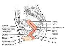 Die Gebärmutter reicht vom äußeren Muttermund bis zur Öffnung zum Eileiter und gliedert sich in einen Gebärmutterkörper mit dem nach oben zeigenden Gebärmuttergrund (Fundus uteri, dem größten Teil der Gebärmutter) sowie dem nach unten gerichteten Gebärmutterhals, letztere beide sind durch die Gebärmutterenge (Isthmus uteri) verbunden bzw. gegeneinander abgesetzt.[4][5] Ihre ausgeprägte Schicht aus glatter Muskulatur wird besonders bei der Wehentätigkeit vor und während der Geburt eines Kindes aktiv.