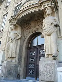 Das Gebäude ist ein symmetrisch proportionierter Bau im Stil des wilhelminischen Barocks mit Jugendstilelementen. Die Gliederung der auffälligen Fassade erfolgt durch fünf unterschiedlich gestaltete Fensterreihen und sechs breite Pilaster im Bereich einer doppelt ausgeführten Freitreppe. Zu beiden Seiten des Portals befinden sich von Karl Menser geschaffene, überlebensgroße Skulpturen, die einen Balkon tragen.
